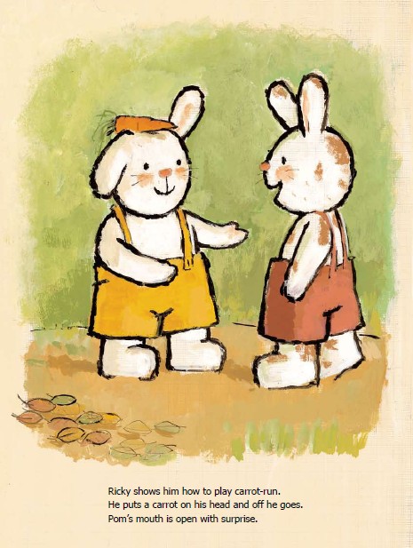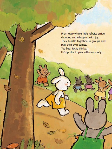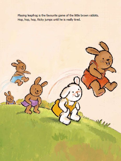 Ricky has many different friends: white rabbits,blackrabbits, brown rabbits and even grey rabbits. They all playdifferent fun games together. Then one day a new rabbit comes andRicky teaches him the various games. They even invent a new ~ameto~ether and become-Rood friends.