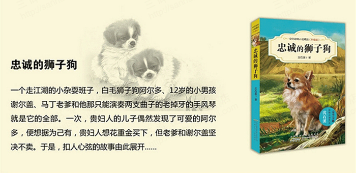 沈石溪编著的《忠诚的狮子狗(升级版)》讲述了,一个走江湖的小杂耍班子——白毛狮子狗阿尔多、12岁的小男孩谢尔盖、马丁老爹和他那只能演奏两支曲子的老掉牙的手风琴就是它的全部。一次,贵妇人的儿子偶然发现了可爱的阿尔多,便想据为己有,贵妇人想花重金买下,但老爹和谢尔盖坚决不卖。扣人心弦的故事由此展开……
