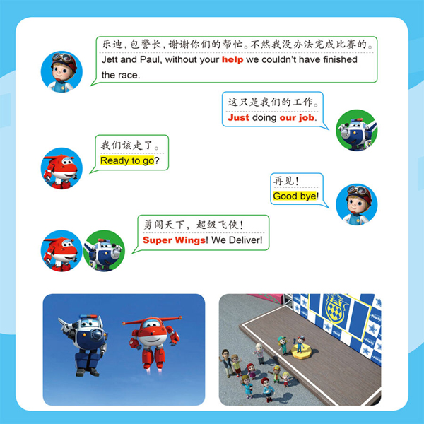 “超级飞侠双语图画故事书”共10册,包含20集动画片内容。它讲述了运输飞机乐迪和他的小伙伴们为世界各地的小朋友送包裹,并帮助他们解决难题、实现梦想的故事。每一个故事里,乐迪都会去不同的国家或城市,展现世界的多元文化。