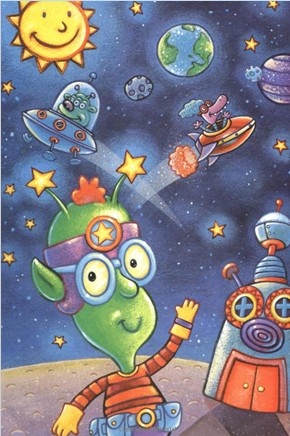Chronicles the adventures of children in space, as they ride around on jet bikes, go for pizza in the family rocket, and read scary tales about the people who live on Earth, in an easy-to-read storybook that comes complete with flash cards to aid reading comprehension.