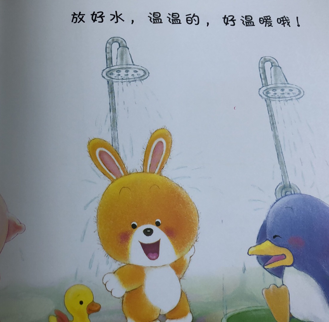 小朋友们都去洗澡啦,小企鹅带了香皂,小猪带了毛巾,小熊带了换洗的小衣服和小裤子。咦,嘎嘎叫的玩具鸭子是谁带来的?