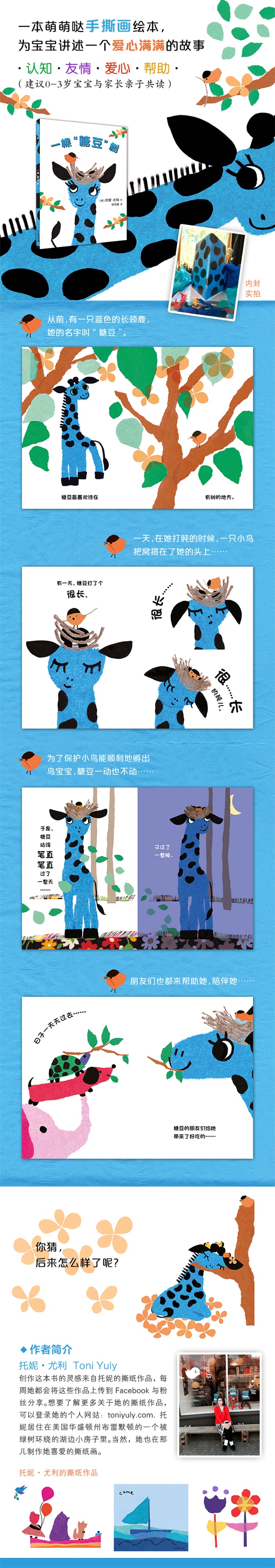 这是一群小动物之间充满爱的友情故事。有一只蓝色的长颈鹿,名字叫“糖豆”。她很喜欢树,而且特别喜欢把头枕在树枝上打长长的盹儿。有一天,糖豆醒来时发现有些不一样。原来是鸟妈妈在她的头顶上做了一个窝。于是,糖豆必须要小心翼翼地等到小鸟们孵出来。她在朋友们的帮助下完成了这件事,并把小鸟们送回到真正的树上。可是,小鸟们更加喜爱爱她这棵“糖豆”树。