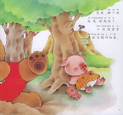 小熊举着放大镜出去散步(很多孩子都有这样的经历),结果发现了一个又一个小朋友,大家随即发明了转着圈、打着滚、蹦蹦跳跳、翻着筋斗散步……看他们那心无旁骛专注于玩耍的小样子,爱死人!我们的宝宝更能分享到、体会到小熊的乐趣,因为随时找到朋友和随时高兴地玩起来,是孩子的天赋,那率真快乐的赤子之心啊,真是让我们感慨不已。他们脸上的嬉笑、诧异、紧张和专注的神情,是那样憨态可掬,我们很容易就能从宝宝和宝宝的小玩伴脸上找到。