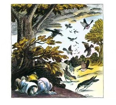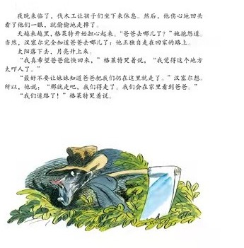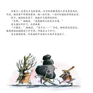 汉塞尔半夜偷听到继母和父亲的对话,得知自己和妹妹格蕾特尔第二天将被父母抛弃在黑森林中,为了保护妹妹,也为了自我保护,汉塞尔从后院悄悄拾了一口袋鹅卵石,装在裤袋里。第二天出发的时候,他沿路撒下捡来的鹅卵石,当夜幕降临的时候,靠着鹅卵石在月光下发出的银光,两个孩子顺利地找到了回家的道路。 汉塞尔的鹅卵石好像一道神奇的护身符,原本是黑色的鹅卵石,因为月光的照耀而闪闪发光。就好像从容向我们讲述这个小故事的格林兄弟,用一个如此简单的意象把孩子们带进了童话的森林。