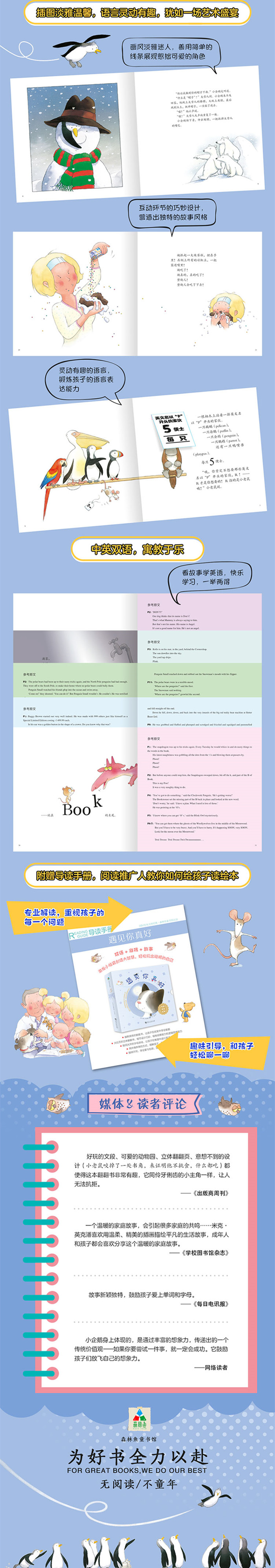米克·英克潘是当今绘本创作领域极具影响力的作家,他的作品风靡全球,销售数千万册,且获奖无数。这一套《遇见你真好》是他的代表作,共七册:《晚安,小熊》《小企鹅和大雪人》《宠物大甩卖》《捣蛋楼梯》《谁吃了我的书》《布朗熊和小公主》《花猫、脏鼠和小鸟》。内容汇集数字启蒙、字母启蒙,暖心绘本,给孩子知识力、幽默力、善良力、勇敢力,让孩子拥有高逆商、强定力、同理心。