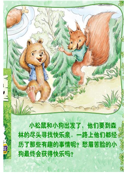 这是一个让孩子学会快乐的故事。小松鼠常说自己是森林里最快乐的小动物,他快乐地晒太阳,快乐的采松果。可是有一天,小松鼠遇到了一只愁眉苦脸的小狗,小狗什么都担心,什么都抱怨,小松鼠答应帮助小狗找寻快乐。一路上,小松鼠总能笑口常开,从麻烦里面找到一些有趣的事情。快乐是可以传染的,小狗终于发现快乐其实就在他的身边。