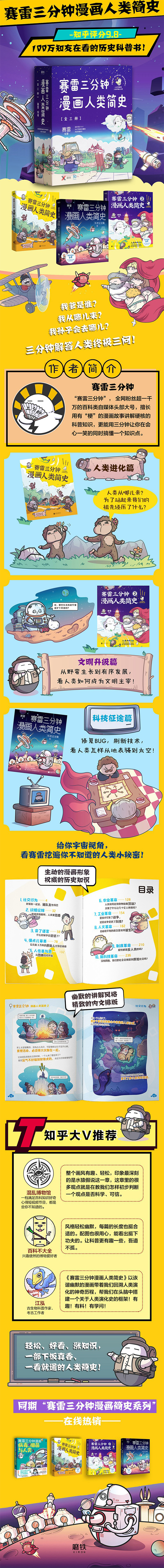 《赛雷三分钟漫画人类简史》系列用精简的、趣味性的语言,冲击力强的画面,从细节拆解人类进化的历史。系列共三册,按照人类史时间线,从人类进化讲到文明发展,从工业革命讲到科技创造,*后还有对人类未来的大胆猜想;整套书给读者以宇宙视角,带领读者刷遍人类进化发展史的昨天与明天!