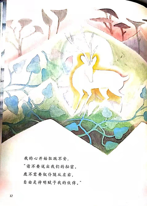 ▲一个所有中国妈妈都应该会讲的故事。▲中华文化中最美的一只鹿,映出人性的善恶美丑。▲一本关于诚信的书,戒贪婪,戒见利忘义。▲作家保冬妮和画家刘巨德携手诚意之作。在《九色鹿》的众多版本中,这是最出色的一个,文图均由名家创作,具有较高的文学价值和艺术价值。原创图画书领军作家保冬妮和清华美院教授、著名画家刘巨德用诗一般的语言和画面,重新讲述了九色鹿这个古老的故事。诗歌的段落和句式,暗含着节奏和韵律,似乎让我们看到古老的《摩罗衍那》的叙事风采,以及泰戈尔般优美洗练的抒情乐章:“不要打扰我,你这个黑夜的精灵。菩提树是我的华盖,椰林是我的屏障,恒河是我的母亲啊,他们都在守护我。”难得的是文字和画面形成一种呼应暗合,由繁及简,从而给阅读以想象的空间,这样的留白更使得整个图画书平添了几分东方式的含蓄温婉。图画深得中国传统绘画艺术的写意精髓,吸收与采纳了敦煌壁画式的绘画风格,“秀骨清像”,修长,清朗,飘逸,有一种自在而流动的气韵,更集中了中国传统艺术的线描造型、装饰性构图、工笔重彩、以形写神等方面的特点。而强烈的连环画叙事方式,又使得故事看上去更加简洁、曲折和生动,其结构上的对称、反复、重叠等手法,使得