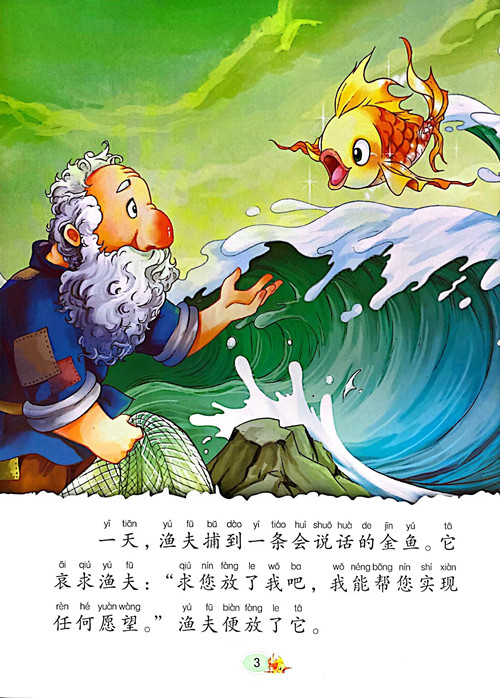 渔夫捕到一条会说话的金鱼,金鱼说,把它放生就能满足愿望。渔夫的妻子总是不满足,向小金鱼提出了一个又一个的要求。老太婆无休止的追求变成了贪婪,从最初的清苦,继而拥有辉煌与繁华,最终又回到从前的贫苦。故事告诉我们,追求好的生活处境没有错,但关键是要适度,过度贪婪的结果必定是一无所获。