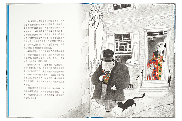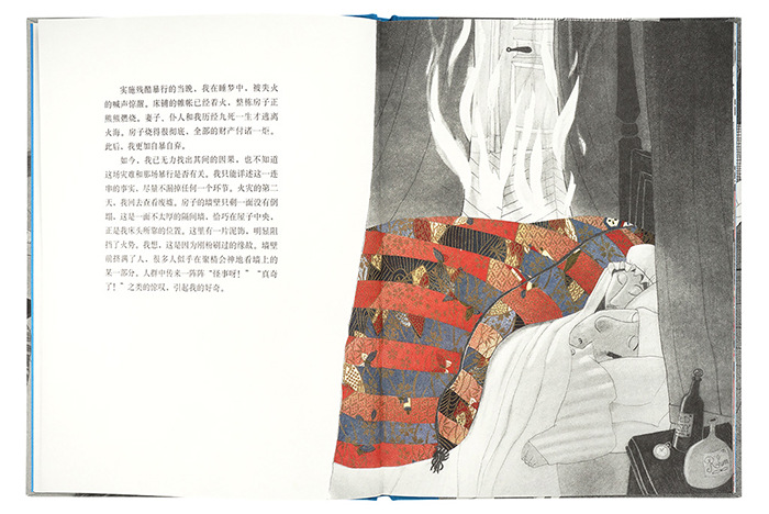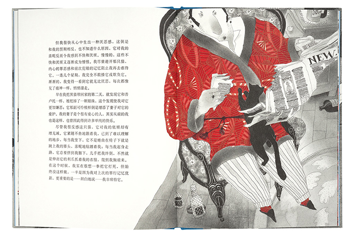 插画家曼索特为本书绘制插图时说:“爱伦·坡几乎病态的幽默,使我采用了一种截然不同的创作方式。”他用黑色粉蜡笔大块涂抹《黑猫》中的场景,以自由不拘的角度取镜,并且将人物、猫和器具加以变形,只在主角的身上运用最鲜艳抢眼的色彩,凸显出主角疯狂的行为背后,那奇怪扭曲的心理历程。全书在活泼动感中融入无比的惊悚、诡异和荒谬。本书1995年入选博洛尼亚国际儿童书插画展和布拉迪斯拉发国际插画双年展。