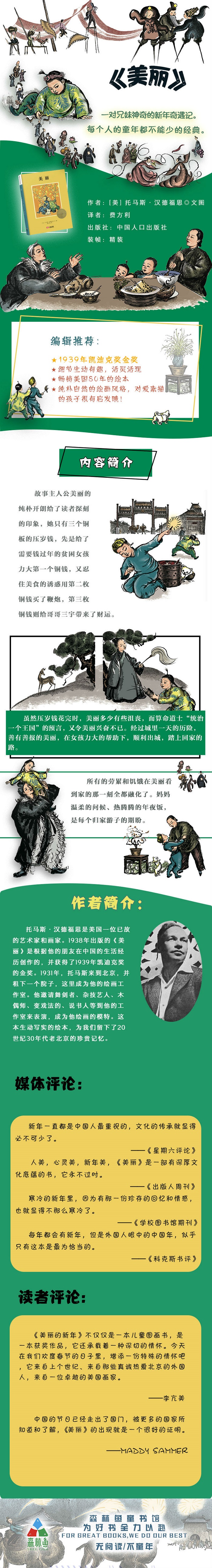 新年一直都是中国人*重视的,文化的传承就显得必不可少了。 ——《星期六评论》 人美,心灵美,新年美,《美丽》是一部有深厚文化底蕴的书,它永不过时。 ——《出版人周刊》 寒冷的新年里,因为有那一份珍存的回忆和情感,也就显得不那么寒冷了。 ——《学校图书馆期刊》 每年都会有新年,但是外国人眼中的中国年,似乎只有这本是*为恰当的。 ——《科克斯书评》