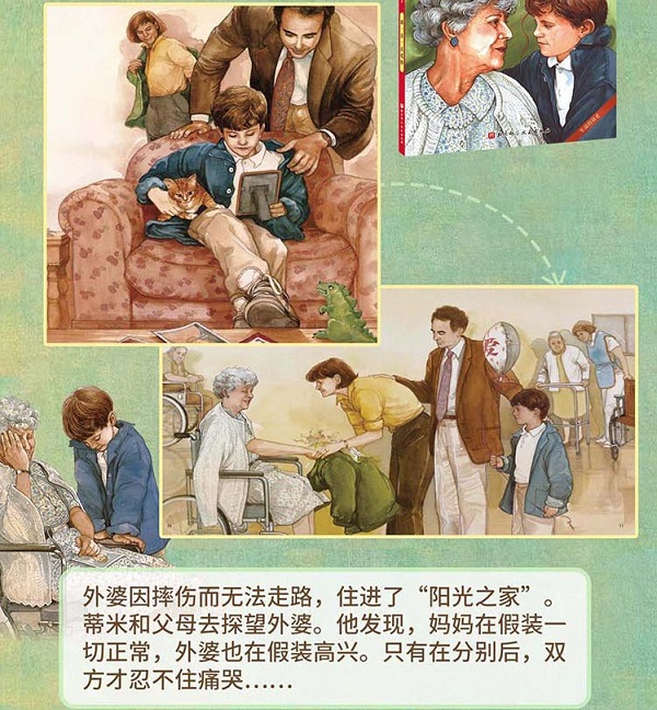 外婆因摔伤而无法走路,住进了“阳光之家”。蒂米和父母去探望外婆。他发现,妈妈在假装一切正常,外婆也在假装高兴。只有在分别后,双方才忍不住痛哭…… 生命的衰老、亲人的分离其实离孩子并不遥远, 彼此说出内心真实的想法,也是一种爱, 这种爱,给我们抵挡人生严寒的力量。 伊夫·邦廷用细腻而平实的笔触刻画每一个细节。面对生命的衰老、亲人的分离,主人公蒂米帮助他的家人战胜了内心的恐惧。这个故事告诉我们,孩子也可以给大人以真实的安慰。 ——《科克斯书评》 真实描绘悲伤的情绪,同时又给人以希望。 ——美国图书馆协会《书单》杂志
