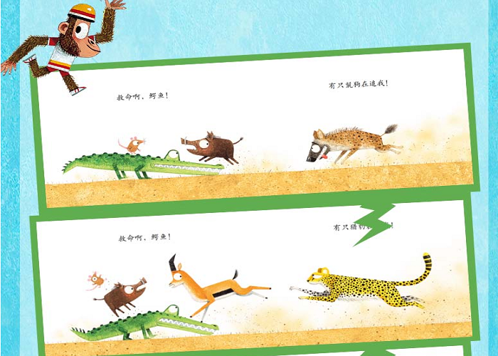 别害怕,合作和友谊蕴含着意想不到的能量,救命啊!好心的鳄鱼!老鼠来了,原来是蛇在追赶它!老鼠爬到鳄鱼背上,鳄鱼大吼一声,吓走了蛇。蛇刚跑,野猪又在鬛狗的追赶下跑了过来。野猪也爬到了鳄鱼的背上,鳄鱼背上的动物越来越多,就连犀牛都来找鳄鱼帮忙。这时,一只饥肠辘辘的狮子出现了,鳄鱼能够赶走狮子吗?