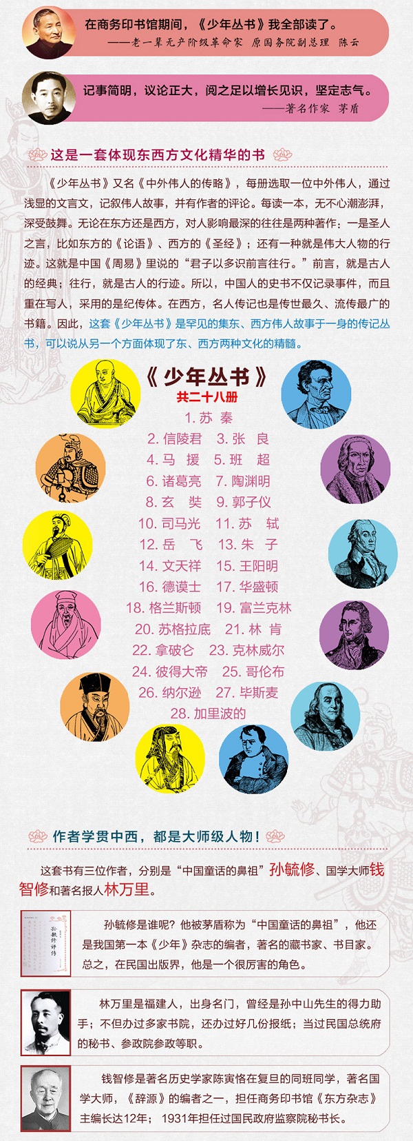 《少年丛书》*早于1908年冬天由张元济主持的上海商务印书馆编译所出版,又名《中外伟人的传略》。其首任编辑和作者是林万里,第二任编辑是编辑大家孙毓修,也是这套丛书的主要作者,后期加盟写作的骨干还有国学大家钱智修。这套书成为民国年间非常畅销的一套面向青少年的人物传记丛书。几十年间几乎年年加印数次,影响了一代又一代的青少年由此走上振兴中国之路。著名作家张天翼、赵景深、陈伯吹等都曾深受这套书的影响。著名作家茅盾曾评论这套丛书说:“记事简明,议论正大,阅之足以增长见识,坚定志气。”