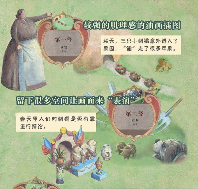 1.本书不同于一般的绘本,这个故事以戏剧非现实、非写实又具有童心的手法来呈现。全书共分两幕及后记,角色有人类(惩罚者)、狗(搜捕者)、乌鸦(幸灾乐祸者)、刺猬(犯错者)、苹果树(说明事理者)、小猪(支持公理者),共演一出精彩的儿童剧。