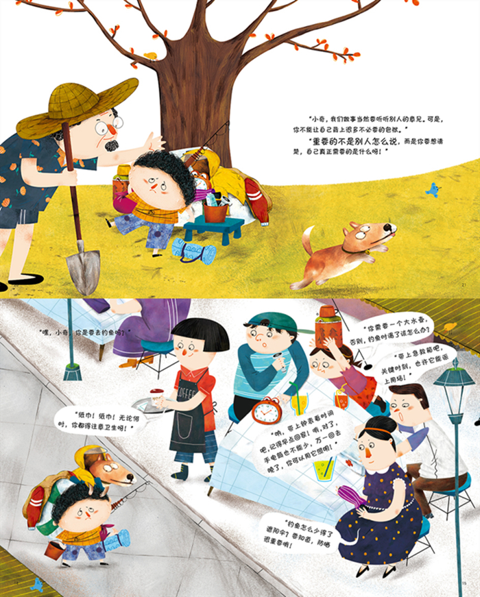 带上一个用来装鱼的小桶吧,带一个方便休息的吊床吧……本来只是想轻轻松松去钓鱼的小奇,在听了大家的建议后,还没到目的地就累得气喘吁吁了。这样的钓鱼之旅还能让人有好心情吗?懂得听取别人的意见是好事,但是我们也要学会分辨,懂得取舍,知道自己真正想要的是什么!