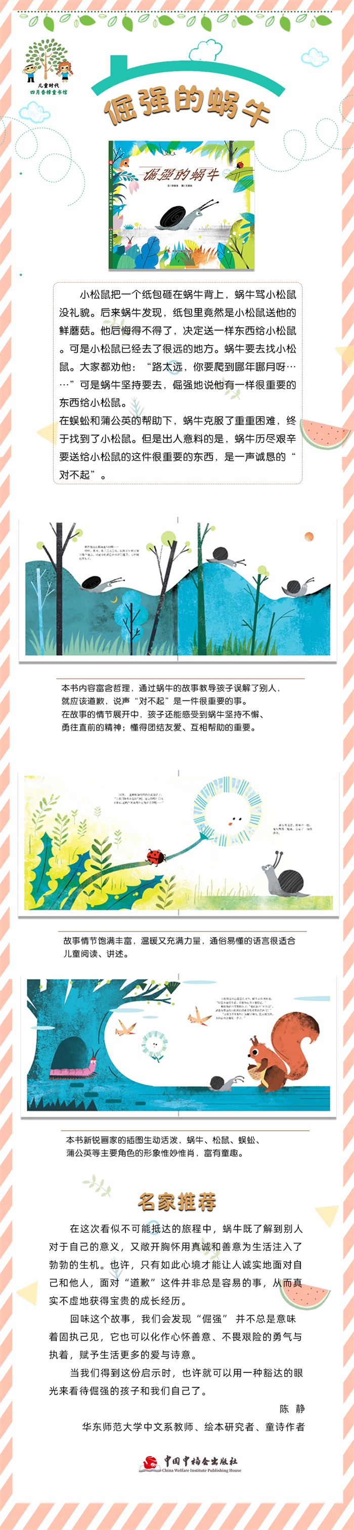 ★本书内容富含哲理,通过蜗牛的故事教导孩子误解了别人,就应该道歉,说声“对不起”是一件很重要的事。在故事的情节展开中,孩子还能感受到蜗牛坚持不懈、勇往直前的精神;懂得团结友爱、互相帮助的重要。 ★故事情节饱满丰富,温暖又充满力量,通俗易懂的语言很适合儿童阅读、讲述。 ★本书新锐画家的插图生动活泼,蜗牛、松鼠、蜈蚣、蒲公英等主要角色的形象惟妙惟肖,富有童趣。