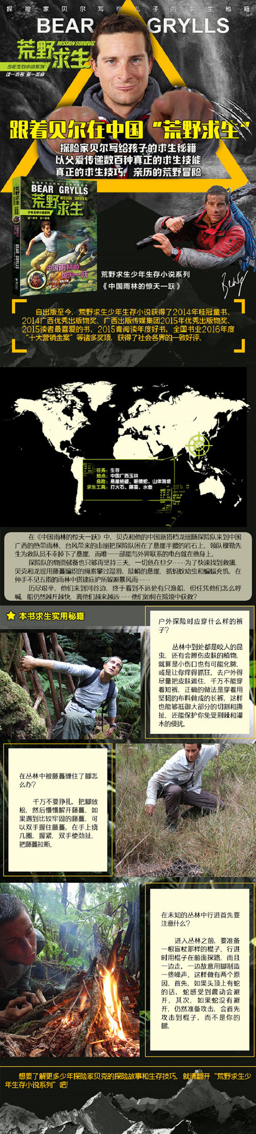 关于本系列 “荒野求生少年生存小说系列”是野外生存大师贝尔•格里尔斯专门为广大少年儿童,特别是为三个儿子创作的作品。贝尔将自己丰富的野外生存经验融入精彩的少年历险小说,在动人心魄的故事情节中,生动描述了上百种简洁而实用的求生技巧,传递了野外求生的永恒的法则“永远保持微笑,只要活着就有希望”,引领小读者在危险环境中,镇静从容,险境求生。一望无际的滚烫沙漠、万年冰封的茫茫荒原、步步惊心的热带雨林、狂鲨出没的加勒比海域、怪鳄奔袭的澳大利亚河谷、猛虎藏身的印度尼西亚雨林……少年探险家贝克深陷绝境,没有食物,没有水,没有救援,面临着重重危机,他该如何只靠自己的双手和智慧顽强求生?亲身验证的险境求生技巧,逆境求生的少年硬汉形象,父亲对儿子的真情大爱,让本系列图书成为一套专为少年儿童创作的荒野求生的探险奇作和险境求生的实用宝典。 关于本书