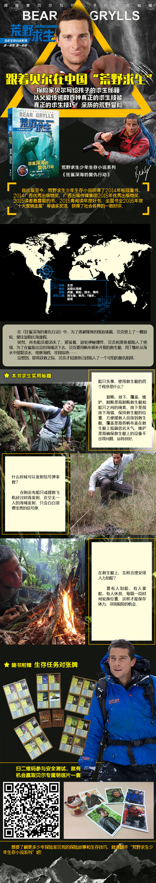 关于本系列 “荒野求生少年生存小说系列”是野外生存大师贝尔?格里尔斯专门为广大少年儿童,特别是为三个儿子创作的作品。贝尔将自己丰富的野外生存经验融入精彩的少年历险小说,在动人心魄的故事情节中,生动描述了上百种简洁而实用的求生技巧,传递了野外求生的永恒的法则“永远保持微笑,只要活着就有希望”,带领小读者在危险环境中,镇静从容,险境求生。 一望无际的滚烫沙漠、万年冰封的茫茫荒原、步步惊心的热带雨林、狂鲨出没的加勒比海域、怪鳄奔袭的澳大利亚河谷、猛虎藏身的印度尼西亚雨林……少年探险家贝克深陷绝境,没有食物,没有水,没有救援,面临着重重危机,他该如何只靠自己的双手和智慧顽强求生? 亲身验证的险境求生技巧,逆境求生的少年硬汉形象,父亲对儿子的真情大爱,让本系列图书成为一套专为少年儿童创作的荒野求生的探险奇作和险境求生的实用宝典。 关于本书 为了逃避媒体的围追堵截,贝克登上了一艘游轮,驶往加勒比海度假。 突然,所有船员都消失了。紧接着,游轮神秘爆炸,贝克和乘客都陷入了绝境。为了在鲨鱼出没的海域活下去,贝克要用帆布修补开裂的救生艇,用T恤衫从海水中提取淡水,观察海鸥,寻找陆地…… 没想到,即将获救之际,贝克才知道他已经陷入了一个可怕的复仇陷阱。