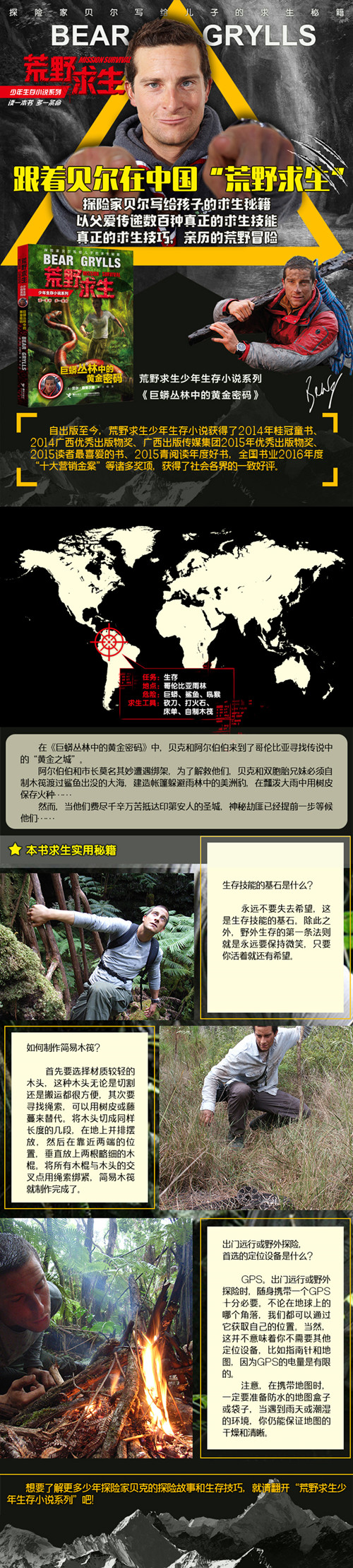 《巨蟒丛林中的黄金密码(拓展版)/荒野求生少年生存小说系列》讲述了贝克和阿尔伯伯来到哥伦比亚寻找传说中的“黄金之城”。 阿尔伯伯和市长莫名其妙遭遇绑架,为了解救他们,贝克和双胞胎兄妹必须自制木筏渡过鲨鱼出没的大海,建造帐篷躲避雨林中的美洲豹,在瓢泼大雨中用树皮保存火种…… 然而,当他们费尽千辛万苦抵达印第安人的圣城,神秘劫匪已经提前一步等候他们……