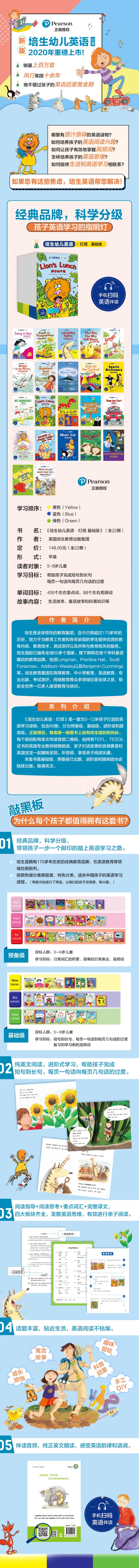 “培生幼儿英语”系列是一套为3—12岁儿童打造的英语启蒙图书。该系列按难易程度和儿童的英语学习水平分为预备级、基础级、进阶级和提高级,共89册。本套书是“培生幼儿英语”系列的基础级,为5—8岁儿童量身打造,包含22个故事,能够帮助孩子由单词、词组向完整句子进阶,并学会完整的英语表达。本册书讲述了几个开开心心去动物园的小朋友,在动物园见到很多不同的动物的故事。小朋友在动物园和袋鼠一起吃午餐,看见小男孩的气球被一个大猩猩抢走,看见扑腾着飞的可怕的蝙蝠。