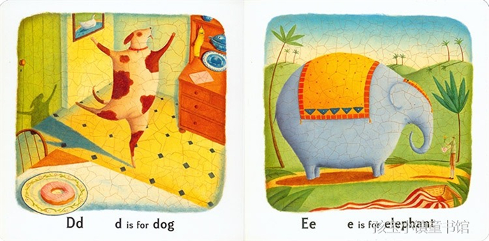 这本ABC字母启蒙绘本绝非一般的字母书!这本书乍看没什么特别,一副画下面一句标准“台词”,A is for apple, B is for balloon…但只要细细观察,你会发现这本书实在是太有意思了,原来每页的图都可以在前一页的内容遥相呼应!例如E,大象的图案就曾出现在D字母那一页,发现了吗?它就藏在碗橱的碟子上呢!