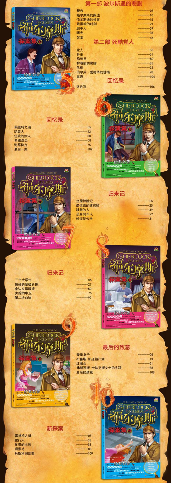 《福尔摩斯探案集》是开辟了侦探小说历史“黄金时代”的不朽经典,被称为推理小说中的“圣经”,一百多年来被译成57种文字,风靡全世界,是历史上最受读者推崇,绝对不能错过的侦探小说。 阿瑟·柯南·道尔编著的《福尔摩斯探案集(经典珍藏版共8册)》选取了最具代表性的福尔摩斯故事,如《血字的研究》《四签名》《红发会》等,根据青少年的阅读能力进行了编排,故事情节曲折离奇,结构严密完整,让人读来有如身临其境。能够充分满足青少年的好奇心和求知欲,培养青少年勇敢坚强的意志,激发他们对分析推理及探寻事物来源的热情。