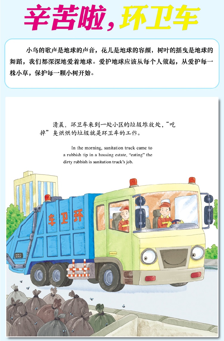 《辛苦啦,环卫车(中英对照 双语有声原创绘本)/成长关键期全阅读 萌车总动员》通过对环卫车的描述让小朋友们了解到环卫车的用途,培养孩子尊重环卫工人、保护环境的好习惯。