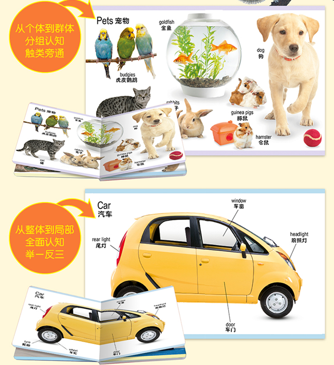 DK幼儿认知百科全书共12册,内容不仅涵盖常见的认知系列,数字、字母、颜色、动物、交通工具等,还包括生活环境、拖拉机、恐龙、宠物等新奇领域。全系列采用英国DK公司高清原版图片,并配有精确、科学的译文。本套图书中英双语,附赠免费音频。内容方面分为12大主题,约有200多个情境,1000多个认知点,3000多个双语词汇,超大信息量,满足1-3岁宝宝的认知需求。全套采用情境认知的方式,由整体到局部,方便宝宝更好地融入其中。