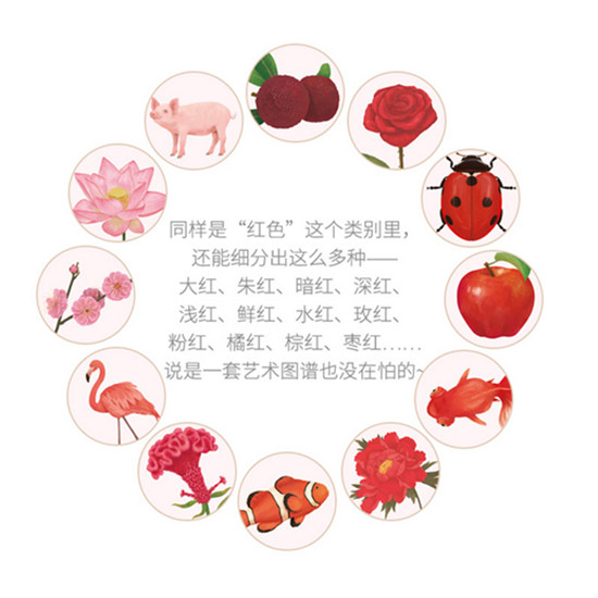 《花花万物做游戏》收录了75种复杂色(棕色、紫色、同时有多色等)的动物、植物、食物、身体、天气等。