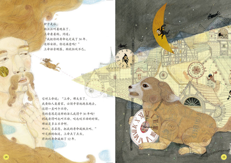 这是来自德国和瑞士的童话故事,本书的前半部分采用水粉绘制,再将各种图纹的纸张剪切粘贴,通过这种拼贴技法进行抽象表达;后半部分则利用铅笔、墨水、水彩颜料等绘制,在暖棕色的基础上大量应用黑色,鲜明地表现了村里人与恶魔间的对立关系。