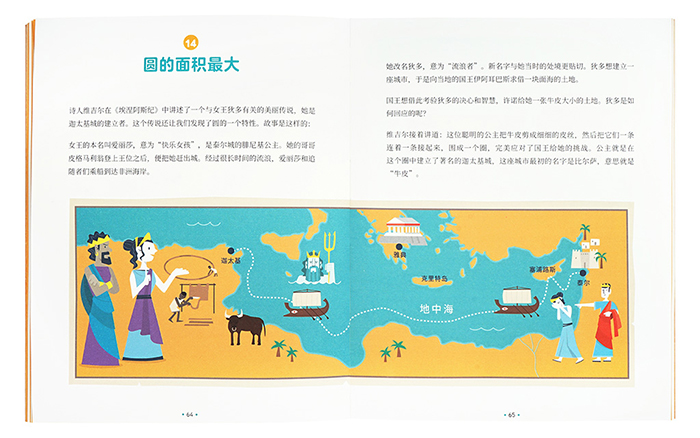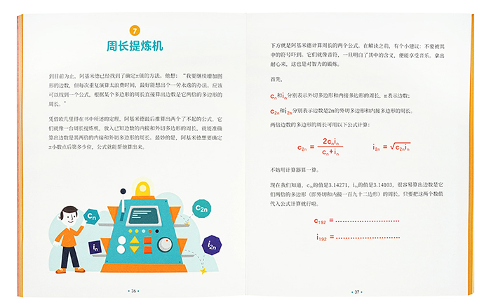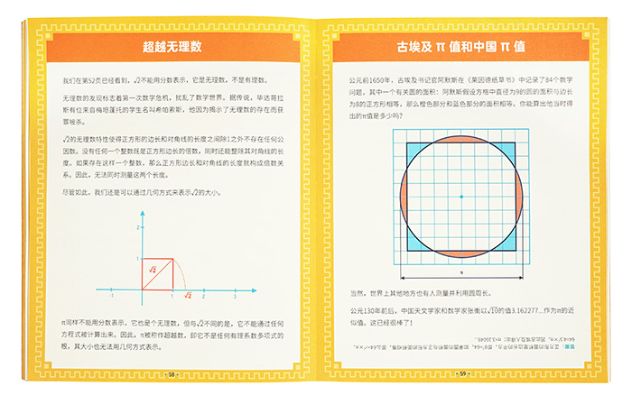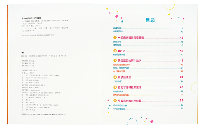 全书分为三部分:主线内容讲述圆周率的诞生、应用及奥秘;蓝色、橙色页面分别对应轻松游戏和深度探索。
