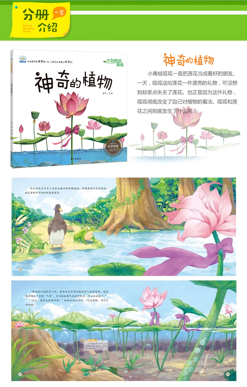 小青蛙呱呱一直把莲花当成最好的朋友。一天,呱呱送给莲花一件漂亮的礼物,可没想到却差点失去了莲花。也正是因为这件礼物, 呱呱彻底改变了自己对植物的看法。呱呱和莲花之间到底发生了什么呢? 森林的池塘里住着一只名