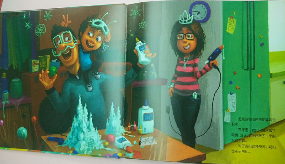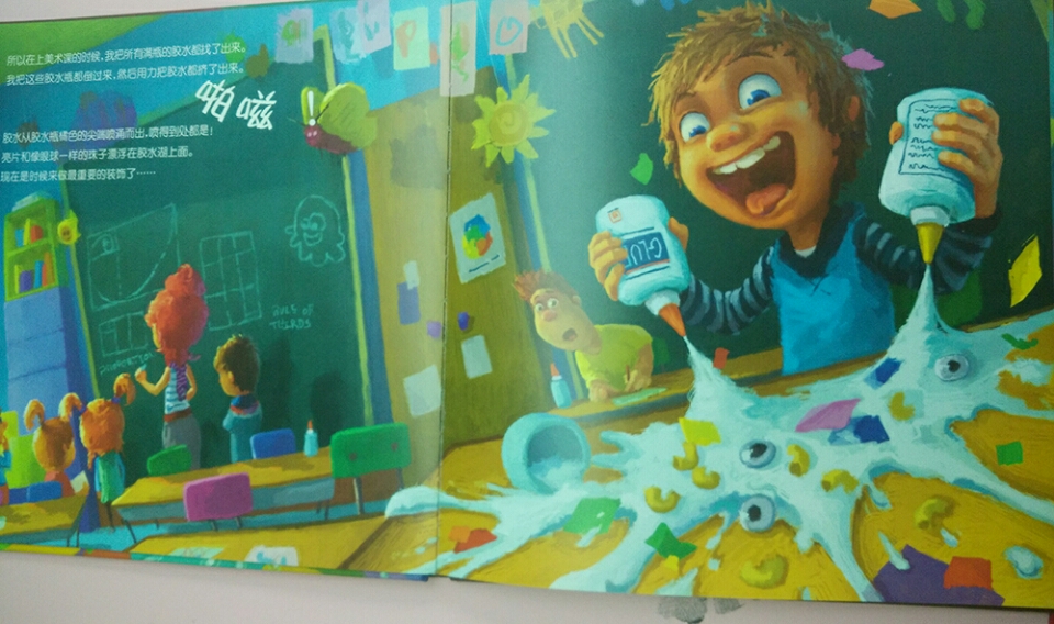 马蒂喜欢胶水。在家里,他和爸爸一起制作胶水眼镜、胶水胡子、戴眼镜和胶水皮球。但是在学校,马蒂的美术老师担忧地告诉他:“胶水太多就不好干了。”