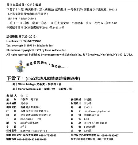 《小恐龙幼儿园情商培养图画书:下雪了!》描述了小恐龙幼儿园的小朋友,他们是一群活泼、可爱的小恐龙,他们在幼儿园里非常快乐!下雪了,小朋友们要去雪地里玩……可是,布兰登老是对艾伯特指手画脚,让艾伯特不能做自己想做的事。快来加入可爱小恐龙的队伍,你会和艾伯特一起学会勇敢坚持自己的想法!