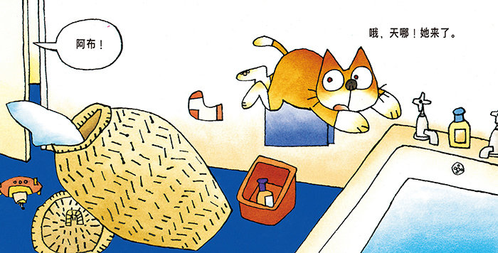 《阿布,洗澡了》:小主人想要给小猫阿布洗澡,但是阿布不喜欢洗澡,他就四处乱藏乱躲,最后情急之下竟然阴差阳错地跳进了浴缸,这下可好,他不想洗澡也难了。
