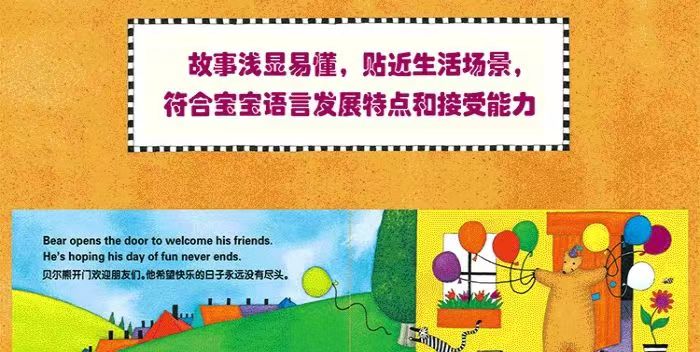 1.《贝尔熊骑自行车》男孩问贝尔熊要搭火车去哪里?他说他要到海边玩水,因为那里有好多小朋友好热闹;男孩问贝尔熊要坐热气球到哪里?他说他要飞上彩虹,看看地球有多美……以两段句型重复呈现,一问一答的形式,透过各种不同的交通工具,让我们跟着贝尔熊遨游世界吧! 2.《工作中的贝尔熊》邮差小熊准备上工喽!忙碌的一天里,邮差小熊到过花店、面包店等等各种地方,辛苦的将信件与包裹一一送达。运用简单的文字和丰富可爱的插图来介绍各个种类的工作,让我们来猜猜看,其他小熊是什么职业呢?小朋友长大以后想从事哪种行业呢? 3.《贝尔熊忙碌的一家》闻闻奶奶做的香喷喷的面包,叔叔正忙着钓鱼,姐姐在……家人们为什么那么忙碌呢?原来,大家都要去参加小宝宝的生日派对。书中末页还绘制出家族的树形结构图,引导宝宝认识家庭成员,学习不同称谓和血缘关系。4.《阳光下的贝尔熊》晴空万里时,贝尔熊喜欢在河边看着船乘着水流行进、下雨时贝尔熊喜欢在雨中唱歌……无论什么天气都不会影响贝尔熊的好心情,因为他总有让自己快乐的办法。跟着贝尔熊一起认识四季中不同的天气吧! 5.《正方形里的贝尔熊》书中每一页皆以一种形状为主题,正方形、圆形、心形……找图形游戏抓住了幼儿成长发育中对几何图形认知的敏感期,帮助宝宝充分认识和区分形状,并提升观察力和专注阅读能力。末页里整合复习前面学到的各种形状。
