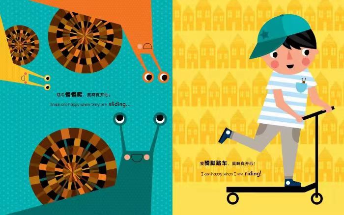 娜塔莉.马歇尔绘*的《呀真开心(中英双语触摸绘本)》是一本为宝宝捕捉快乐心情的大书,里面充满各种简单、可爱的幸福小事,总能让宝宝开心一笑!鱼儿在水里游的时候很开心,蜗牛慢慢爬的时候很开心,长颈鹿伸长脖子吃树上的叶子的时候很开心,猫头鹰咕咕叫的时候很开心,小兔子捉迷藏的时候很开心,小老鼠小口小口吃梨子的时候也很开心……我们呢?我们大口大口啃西瓜的时候很开心,在玩水花的很开心,骑脚踏车的时候很开心,爬树的时候很开心,唱歌的时候很开心,挖萝卜的时候也很开心……我们大家拥抱在一起的时候,都很开心!