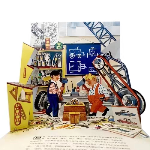 几乎每个小男孩都有同样的大梦想﹣﹣开车。小迪和多多通过建立自己的踏板车实现了这个梦想。?但是,如何在公路上行驶呢?在一辆小汽车的车轮后面都是一个惊心动魄的故事。该怎样制造一辆车呢?修理厂里放满了各种各样的工具和设备,比如锤子、镊子、电钻、螺丝、废旧的刹车盘和齿轮。幸运的是,那里还有一些引擎的图纸和多种多样的设计图。小迪和多多十分认真地研究了这些图纸。小迪思考了一会儿,然后画了几份草图,展示了他对这辆车的构想。