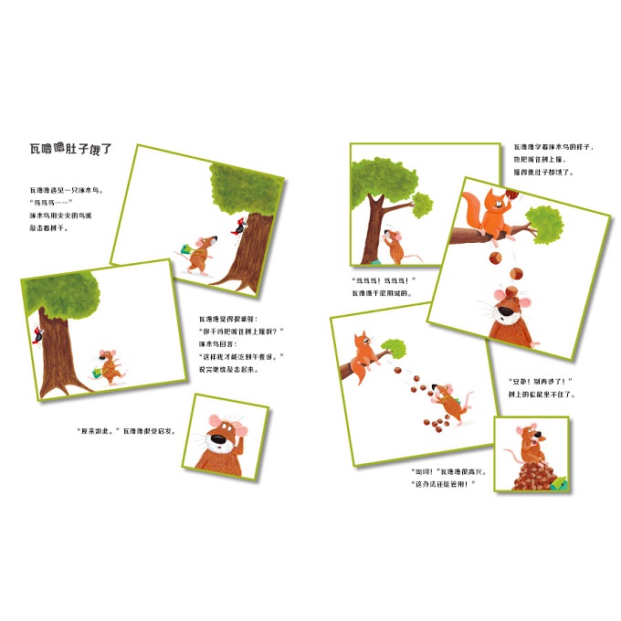 文图结合表现出惊人的幽默效果。如果你仔细看,会发现瓦噜噜作为流浪鼠,竟然包包里还放着一个手机,显然是绘者为了幽默效果的特意安排;你还会看到,为了判别赫曼是否和他一样是流浪鼠,瓦噜噜采取的方式是搬起脚丫来闻一闻看一看,煞有介事的样子让人忍俊不禁。文字不能穷尽的,通过图画得到淋漓尽致的展现。