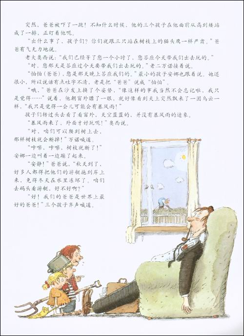 《最好的老爸系列》图画书是芬兰近年最畅销的儿童插图故事系列之一。故事和插图都由芬兰当代著名儿童文学家和插画家马尔古斯·玛雅洛马创作。有意思的是,玛雅洛马本人也有三个孩子,他承认自己就跟故事里的爸爸彭蒂一样,从来不忍心对孩子们说“不”。适当的纵容并不等于溺爱,相反,玛雅洛马认为当下孩子们跟父母相处的机会并不是太多了,而是太少了,大人们的工作压力无形中也转移到了孩子们身上。或许您此刻刚刚下班回家,也和故事里的爸爸一样只想坐下来休息休息,看看报纸,可是请您还是不要拒绝您的孩子想和您一起出去散步的请求,您一定也会和故事里的爸爸一样获得意想不到的收获,毕竟孩子们的童年只有一次!