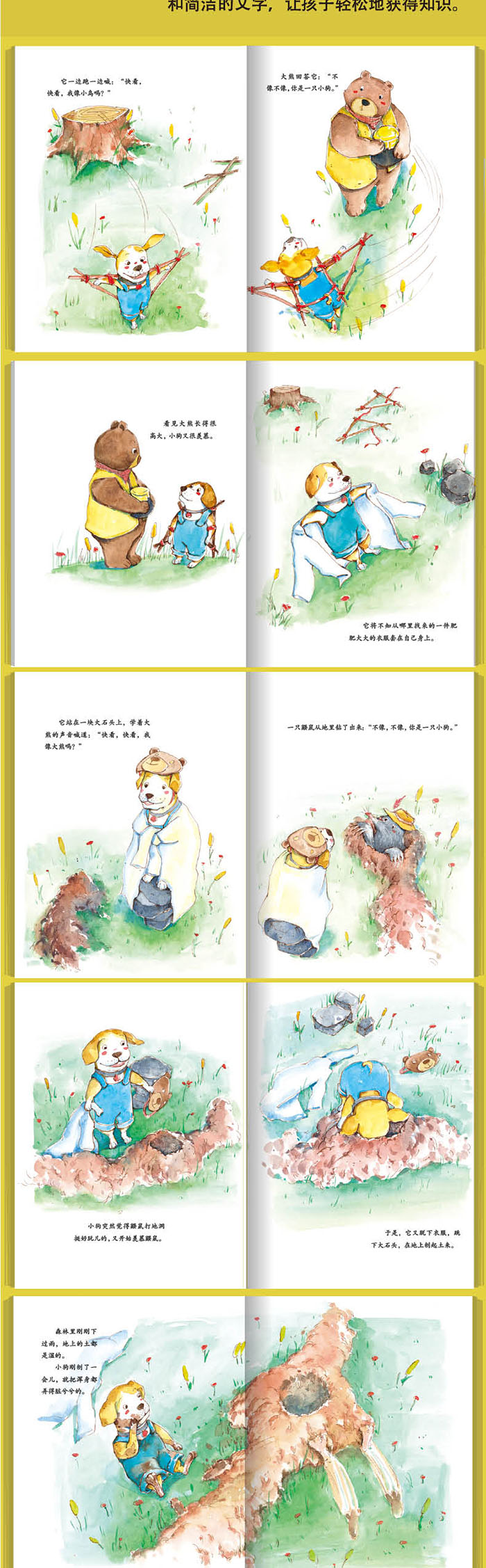 我们总是在羡慕别人,孩子也一样:小狗很羡慕小鸟会飞,羡慕大熊长得高,却忘了自己作为一只小狗,也有自己的乐趣和意义!这是一本适合低幼的国内原创少儿彩色绘本。这本故事书,看似简单,有大篇幅的绘画,字数相对比较少,体现出一种简洁明快的美感,是一本充满了诗情与创意的图画书。也是一本能让孩子们迅速产生共鸣和认同感的图画书。 “熊”孩子犯了错,闯了祸,大人们最先想到的就是批评。书中所选的小朋友们的坏习惯和遇到的事例都是孩子们在成长中会遇到的,非常贴近生活。家长们可以为孩子每天阅读几个故事,告诉孩子们其中的道理,生动的图画、有趣的语言,能很容易地让孩子们融入其中,感同身受,从而达到学习成长的效果。是成长期的小朋友阅读的良选。