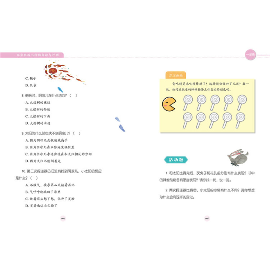 (2)功能性(阅读指导性):本书系在世界范围内精选120本经典图画书,按照年级分册,并且每本书配以精彩的内容简介和艺术鉴赏,首先为不同年龄段的孩子解决了“读什么”“怎么读”的问题。同时,独创性地以“活动与评测”为核心单元,精心设置标准化阅读测评题,科学、客观地评价孩子的阅读成效,解决了阅读课程化趋势下“读得怎么样”这一关键问题。