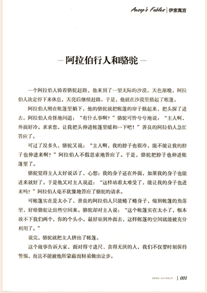 《伊索寓言》中的角色大多是拟人化的动物,它们的行为举止都是人的方式,作者借以形象化地说出某种思想、道德意识或生活经验,使读者得到相应的教育。这些故事篇幅短小却寓意深厚,有的教导人们要正直、勤勉;有的劝人不要骄傲、不要说谎;也有的说明办事要按照规律,量力而行;还有不少反映了强者虽凶残但却常被弱者战胜以及各种寓意深刻的人生道理。内含对社会不平等的抨击;讽刺懦弱、懒惰,赞美勇敢斗争,教人如何处事,辨别是非好坏。