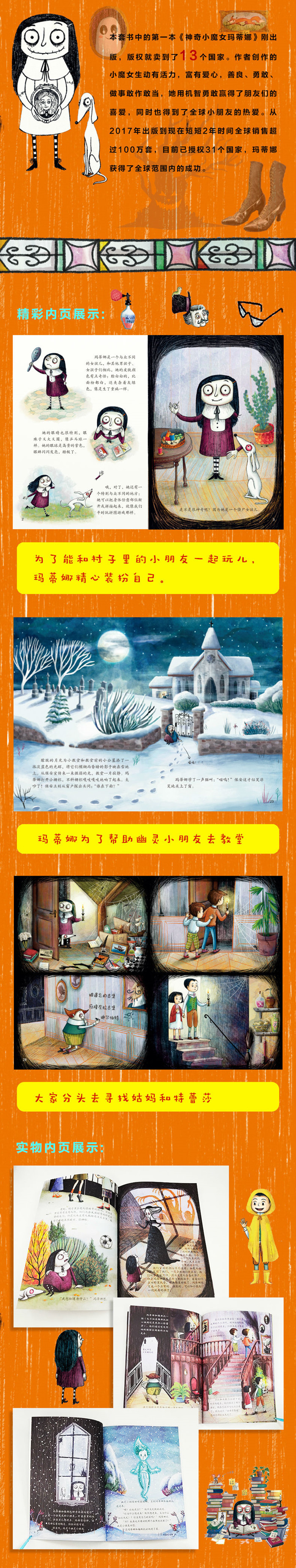 《不一样的玛蒂娜》系列,人物设定和情节都实在让人忍俊不禁。玛蒂娜有着苍白到病态的皮肤,像乒乓球一样凸出来的眼睛,天生时尚的紫色眼影……她和姑妈"死翘翘"以及一只得了白化病叫做"悲剧"的灰狗一起住在"坍塌庄园"里。玛蒂娜最想实现的心愿,是可以结交附近的人类小朋友,认识更多的玩伴,可惜姑妈绝对不同意。直到万圣节来临,玛蒂娜终于找到了机会以最自然的方式潜入人间:她根本用不着化妆!不过当她不小心忘乎所以地把脑袋拿下来玩把戏,会不会吓到她的新朋友们啊?答案是:当然不会啦!小朋友们都觉得她酷毙了!