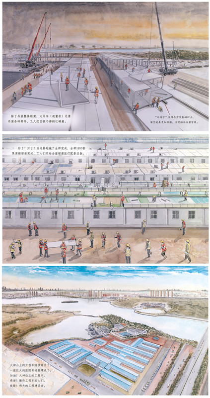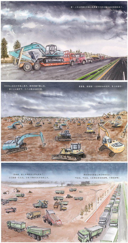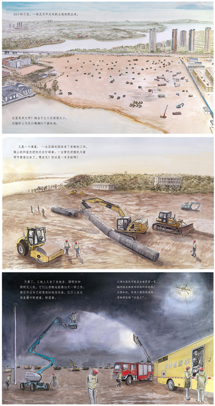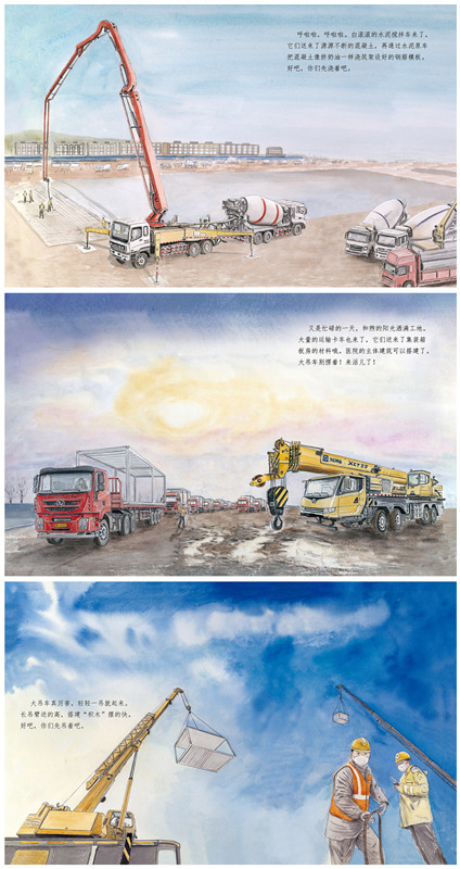 加油!火神山上的工程车用用优美的绘画、精炼传神的文字描述了火神山上的工程车以及火神山医院的建设过程。