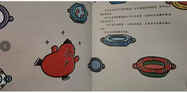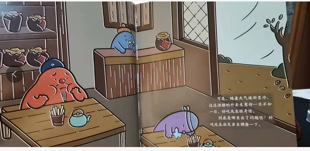 好吃先生在逗逗镇开了一家逗逗酒楼,逗逗酒楼为了招揽生意,开发了送餐上门服务,逗逗酒楼的生意越做越红火。冬天来了,逗逗酒楼的生意却变得大不如从前。好吃先生调查后发现,由于气温低,饭菜还没送到就已经凉了,非常影响口感。好吃先生从博学先生那儿得知有一种专门给食物保温的盘子,叫暖盘。费尽千辛万苦,好吃先生终于买到了暖盘,逗逗酒楼又恢复往日的红火生意啦!