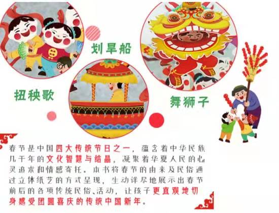 本书通过立体纸艺的方式,利用巧妙的立体机关、翻翻、抽拉、贴纸、转盘来充分调动孩子的好奇心和求知欲;通过互动,提高孩子的动手、动脑能力,并在玩的同时,让孩子感受春节期间的欢乐气氛,了解民间传统习俗,了解关于春节的中华传统文化。