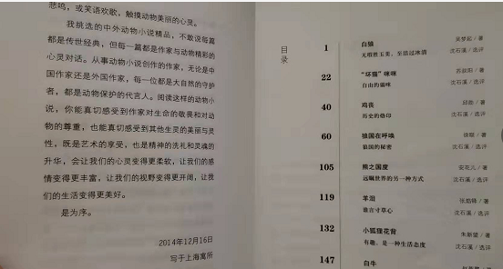 白狼 吴梦起/著 无瑕胜玉美,至洁过冰清 沈石溪/选评 “坏猫”咪咪 苏叔阳/著 自由的猫咪 沈石溪/选评 鸡丧 邱勋/著 历史的烙印 沈石溪/选评 狼国在呼唤 徐联/著 狼国的秘密 沈石溪/选评 熊之国度 安花儿/著 远瞩世界的另一种方式 沈石溪/选评 羊泪 张焰铎/著 谁言寸草心 沈石溪/选评 小狐狸花背 朱新望/著 有趣,是一种生活态度 沈石溪/选评