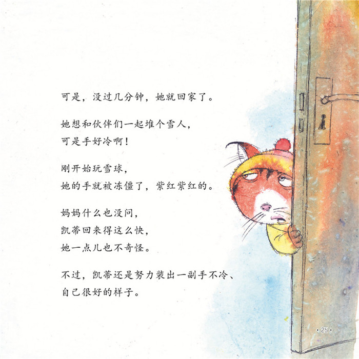 《我就是想要不听话》生活中,我们经常犯错,但不是谁都能正确面对自己的错误,大人总觉得承认错误就是否定自己,或者碍于面子觉得不好意思,有时候,孩子的方法更加值得我们学习。小猫凯蒂想要出去玩雪,按照妈妈说的穿上了自己并不满意的衣服,妈妈却还要求她戴不喜欢的厚帽子和手套,没戴手套是她*后的倔强,就这样没听话的出了门,转眼就被冻得回来了,边自说自话的嘟囔着边默默带上手套,回了房间。你看,虽然有点尴尬,但却尴尬的可爱,没听话的后果自己承担了,虽然没认错,但默默带上手套的动作也算是默认了。犯了错也没关系,孩子们就是需要这样的成长。
